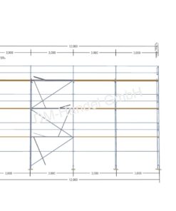 Das abgebildete Stahlgerüst mit Holzböden 102qm Arbeitsfläche ist 12m breit und hat eine maximale Arbeitshöhe von 8,4m.