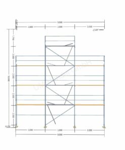 Das abgebildete Stahlgerüst mit Holzböden 80qm Arbeitsfläche ist 9m breit und hat eine maximale Arbeitshöhe von 10,4m.