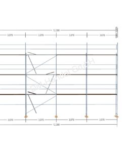 Das abgebildete Alu Gerüst mit Alu-Rahmentafel 104qm Arbeitsfläche ist 12.28m breit und hat eine maximale Arbeitshöhe von 8,4m.