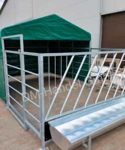 Im Vergleich zu herkömmlichen Kälberställen haben sie eine wesentliche Verbesserung der Haltbarkeit der Konstruktion, die durch die hochwertigen und schweren Stahlpanale erzeugt wird. Dazu kommt natürlich entsprechender Rost- und Korrosionsschutz durch verzinkte Oberfläche. Das Planenzelt bietet den idealen Schutz der Kälber vor Wettereinflüssen. Der Stall hat eine überdachte Fläche von 3x3m und einen Freilauf von 3x2m. Damit lassen sich maximal 9 Kälber bis zu einem Gewicht von 150kg darin halten. Der Futtertrog 3m vor dem Kälberstall sorgt für die optimale Versorgung der Kälber. Durch den leichten Auf- und Abbau lässt sich der Kälberstall 5x3m beliebig verschieben.